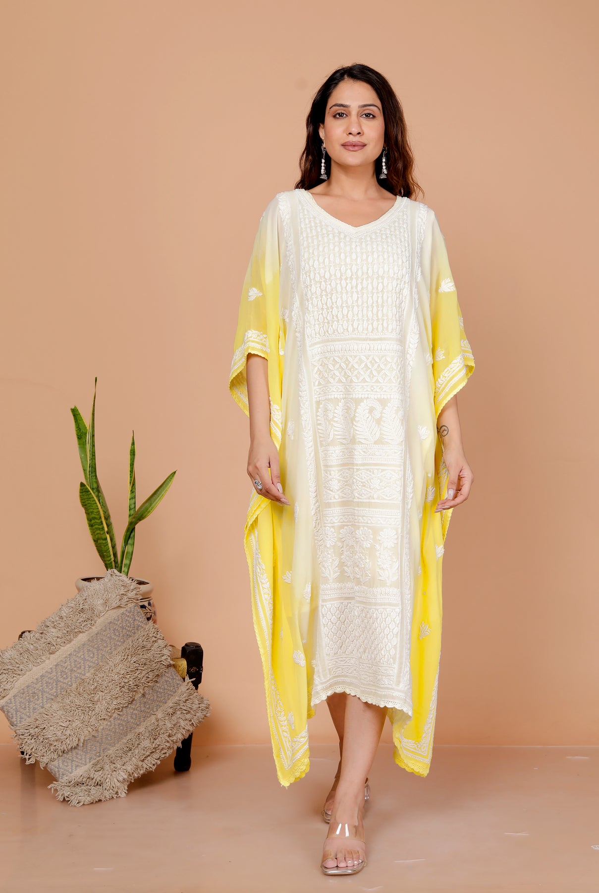 Elevate your style with the Ramona Georgette Chikankari Kaftan, featuring a delicate pastel ombre shade that exudes elegance. The full front panel is intricately embroidered, making this kaftan a unique statement piece. Perfect for standing out in any crowd, it combines comfort with exquisite craftsmanship to enhance your wardrobe effortlessly.