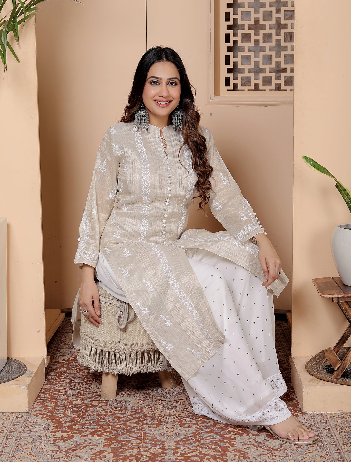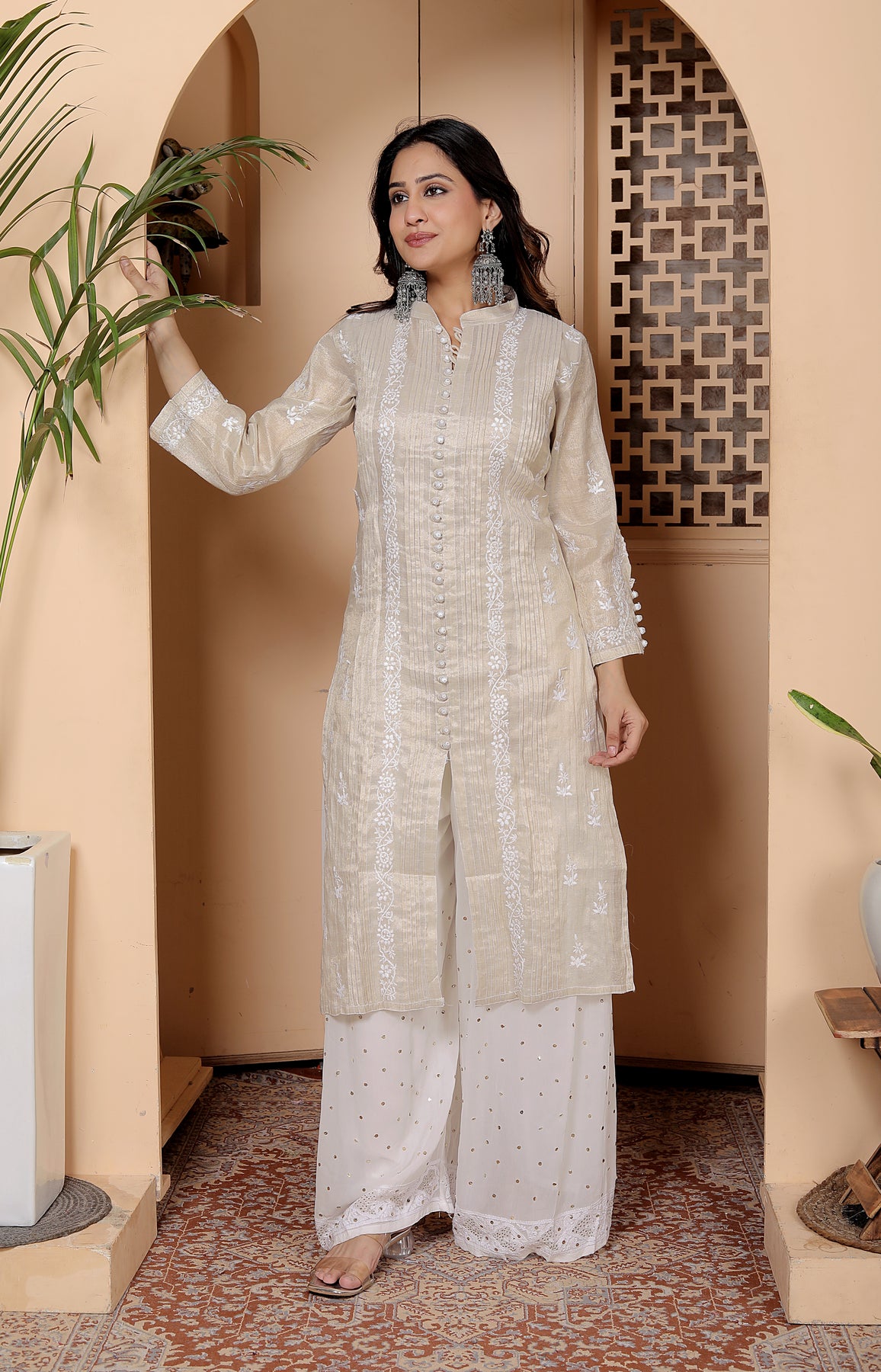 Elevate your festive wardrobe with the Barkha Tissue Chikankari Long Kurti, featuring a new pintex pattern and beautiful hand embroidery. The elegant front slit adds a contemporary flair, making it perfect for celebrations like Sangeet, Diwali, and Ganpati festivals. Stand out in style and bring a touch of traditional charm to your festivities with this exquisite kurti.