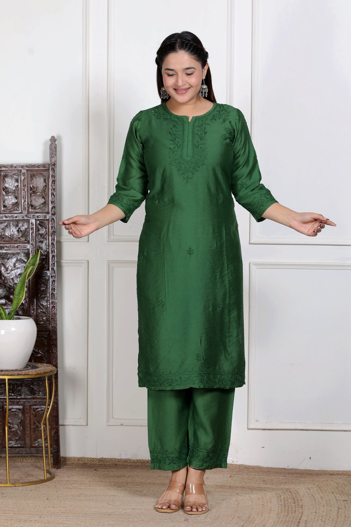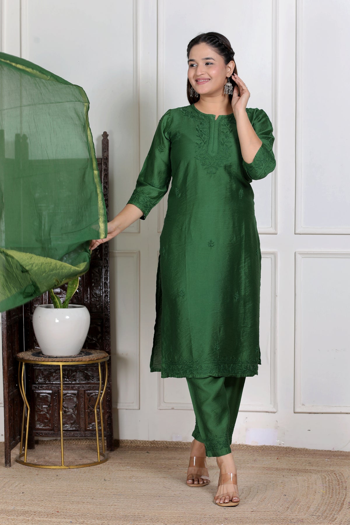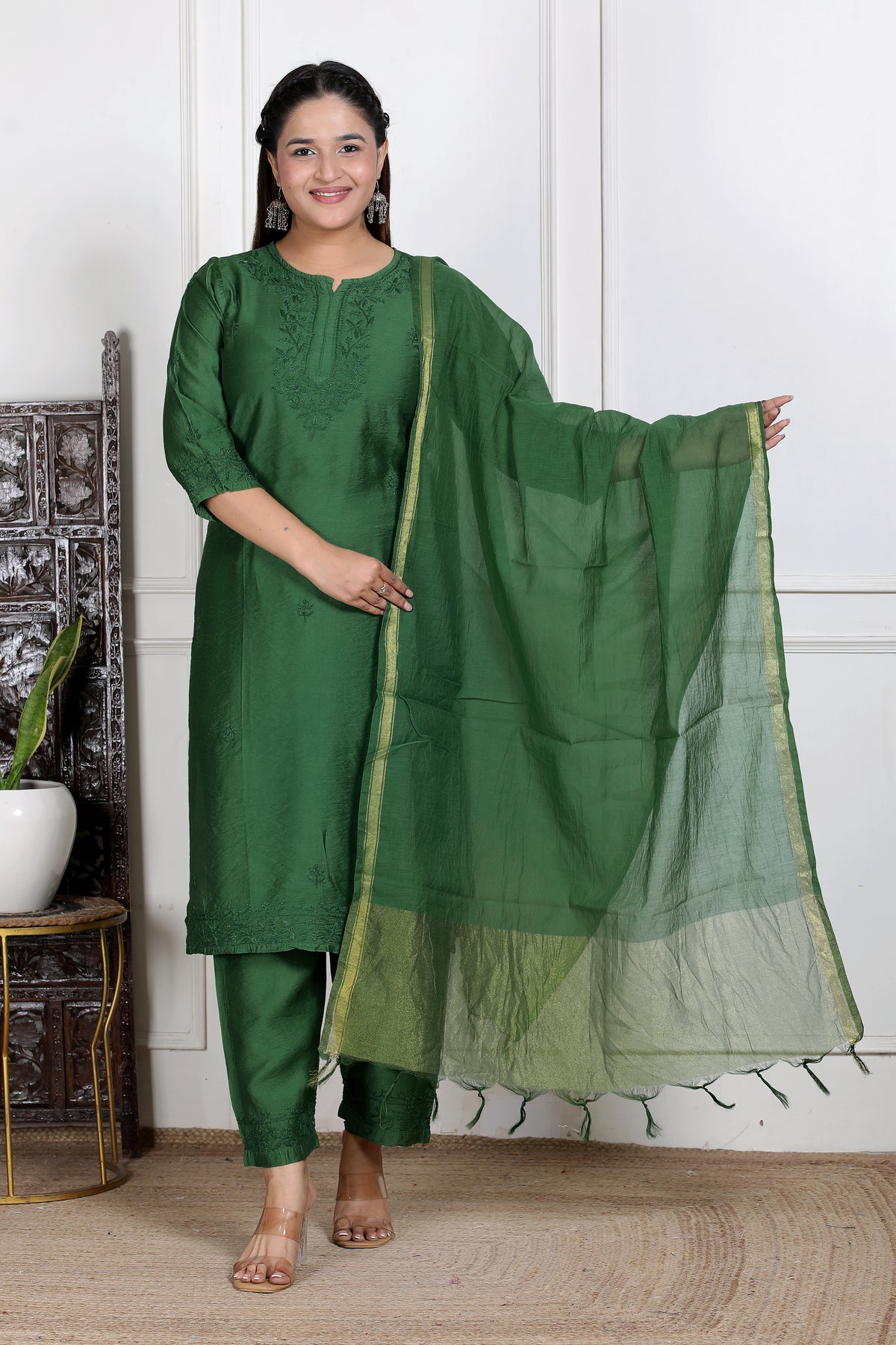 Embrace timeless grace with this exquisite Chanderi Chikankari 3 Piece Set. Crafted from luxurious chanderi fabric adorned with delicate chikankari embroidery, this ensemble strikes the perfect balance between sophistication and understated elegance. Ideal for festivals and mehendi celebrations, it lets you shine with refined beauty rather than bold statements. The thoughtfully curated three-piece design offers versatility and comfort, making it an essential addition to your ethnic wardrobe. Step into any occasion with quiet confidence and effortless poise.