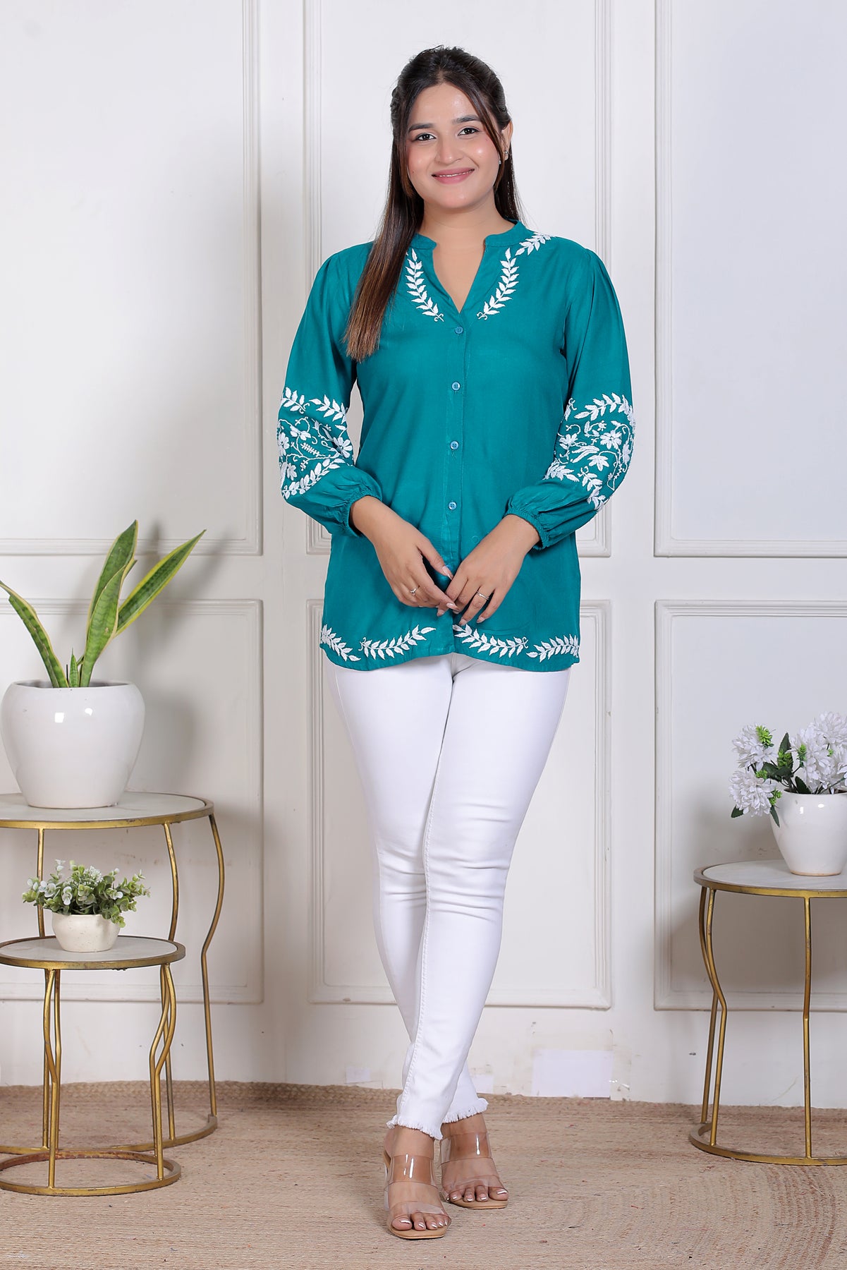Experience effortless elegance with the Martina Rayon Short Top, crafted from the softest rayon for all-day comfort. Its vibrant colors and exquisite hand embroidery make it a standout choice for office wear or casual lunch and brunch parties. Elevate your style and showcase your personality with this beautifully detailed top that combines sophistication and charm.