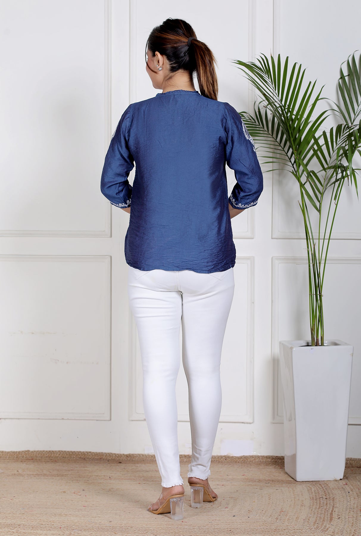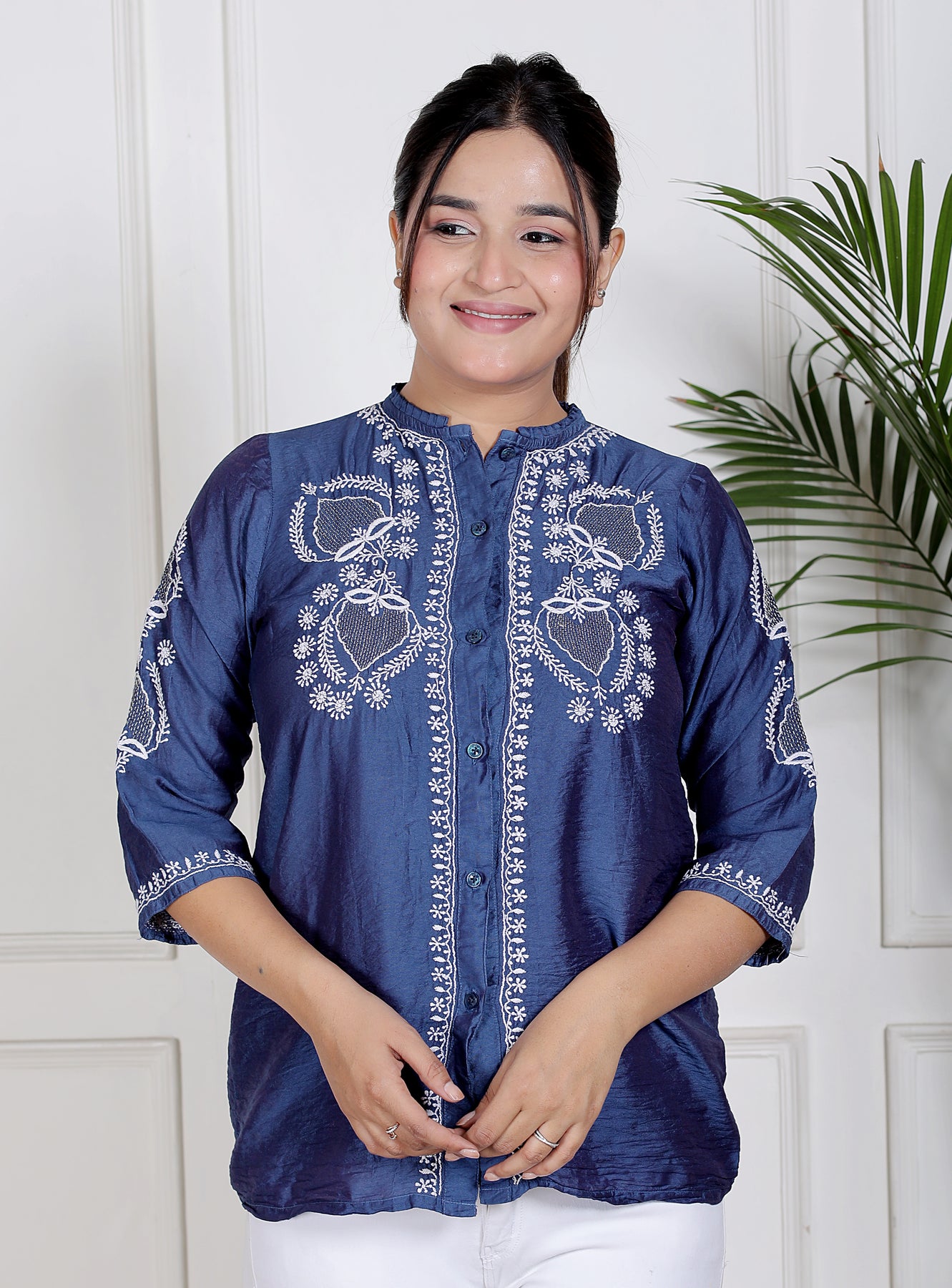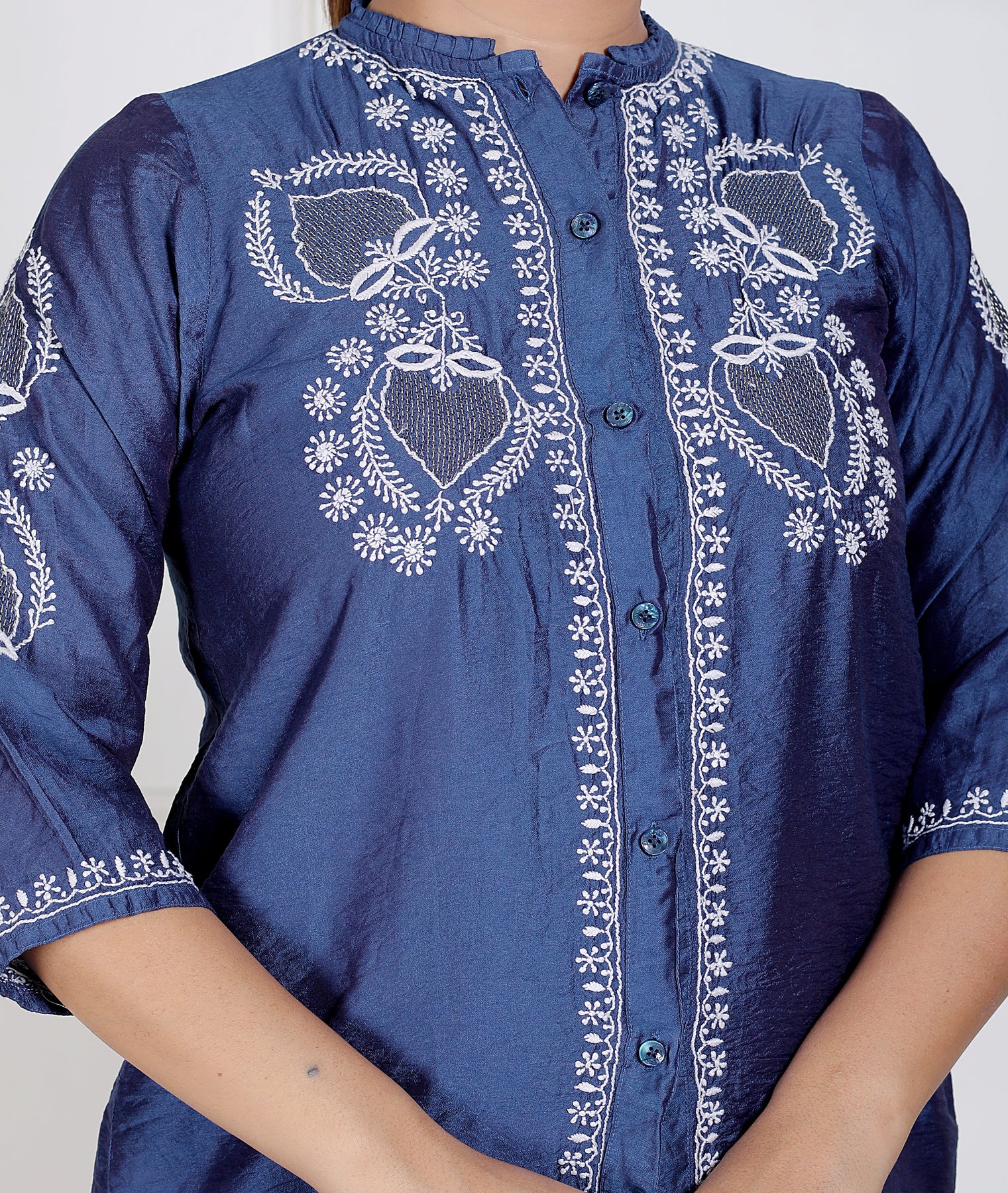 Elevate your ethnic wardrobe with the Zahra Chanderi Chikankari Short Top, a masterpiece of traditional craftsmanship. This exquisite piece features delicate chikankari embroidery adorned with intricate kasab jaal work that catches light beautifully. The elegant pleated neckline adds dimension and sophistication to your look. Crafted from premium chanderi fabric, this short top seamlessly blends timeless artistry with contemporary style, making it perfect for festive occasions or elevated everyday wear.