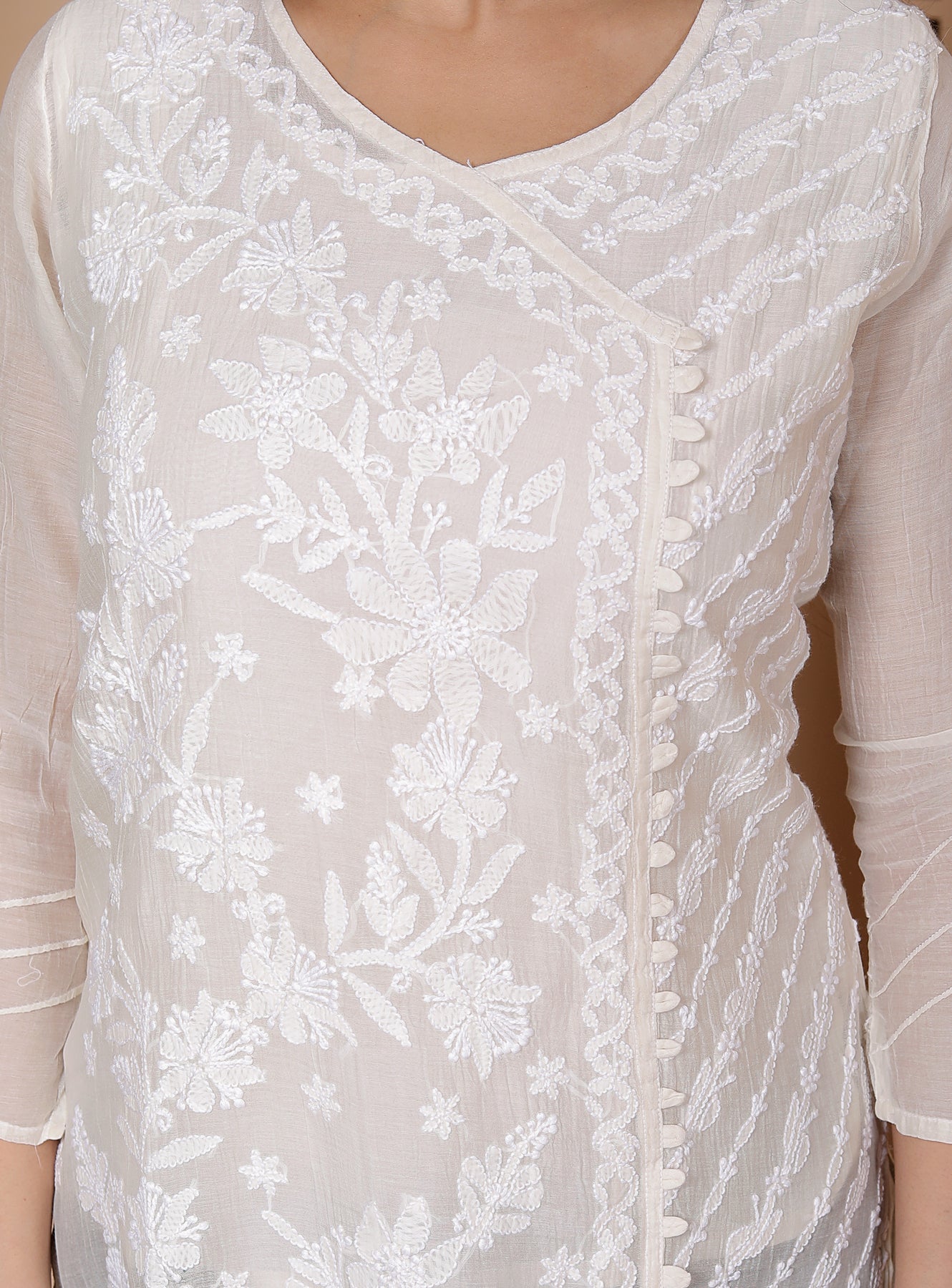 Experience exquisite craftsmanship with the Rimmi Mulchanderi Chikankari short Kurti. Handcrafted by skilled artisans, it features intricate shadow work that adds depth and elegance to your look. This sophisticated piece blends traditional artistry with modern style, making it perfect for any occasion where you want to stand out gracefully. Elevate your wardrobe with this timeless, elegant Kurti that embodies both beauty and finesse.